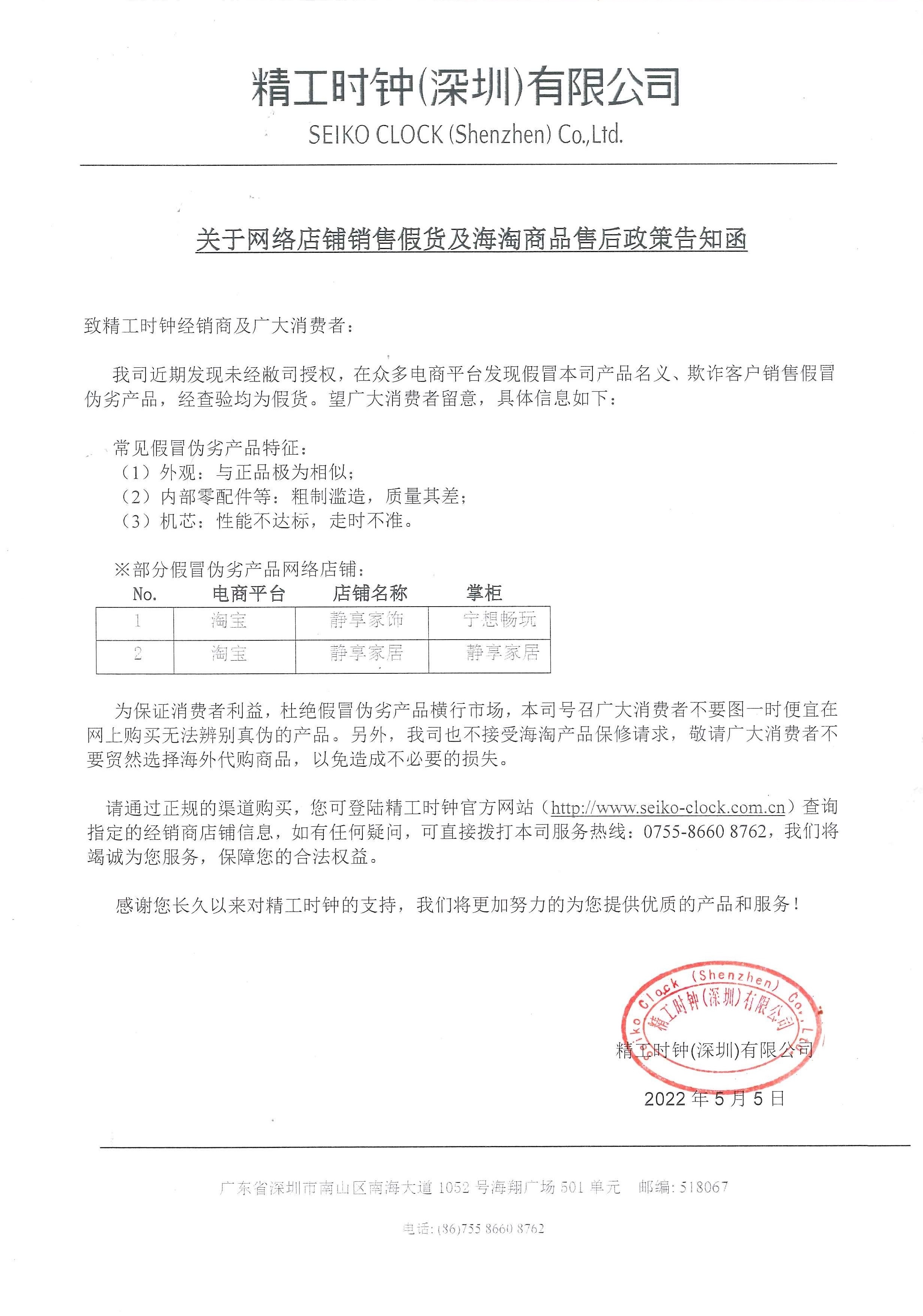 关于网络店铺销售假货及海淘商品售后政策告知函